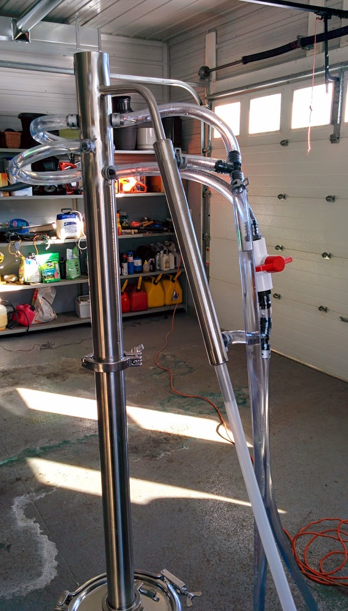 It’s an 8 gallon pot (note the wide base to help keep the center of gravity low). Fully assembled (and on the burner) it stands a proud nearly seven feet tall. the wide base also keeps the heat diffusing nicely across the base of the pot, and, in case you have a small burner or hotplate, it even came with a diffuser plate. The other thing you guys should check out is the closeup shot of the column cooling system: