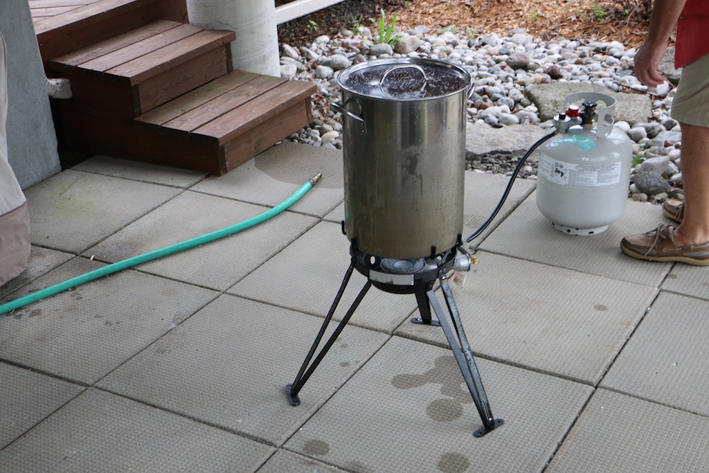 I made a few other changes since the infamous vodka run earlier this year. First, since it wasn’t miserably cold, I mashed outside using a turkey frying rig. I also bit the bullet and turned in my silly plastic spoon for a mash paddle. I’m not exaggerating when I say that the mash paddle was one of the best 35 bucks I ever spent. The long handle allowed me the leverage needed to stir the thick mash comfortably.
